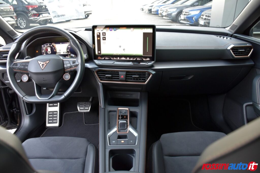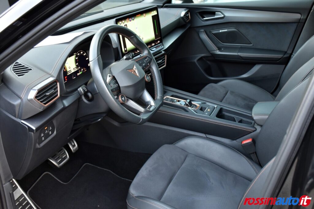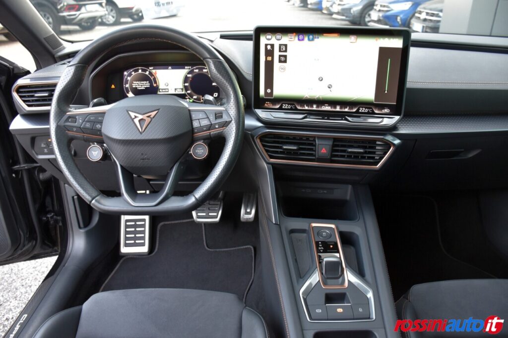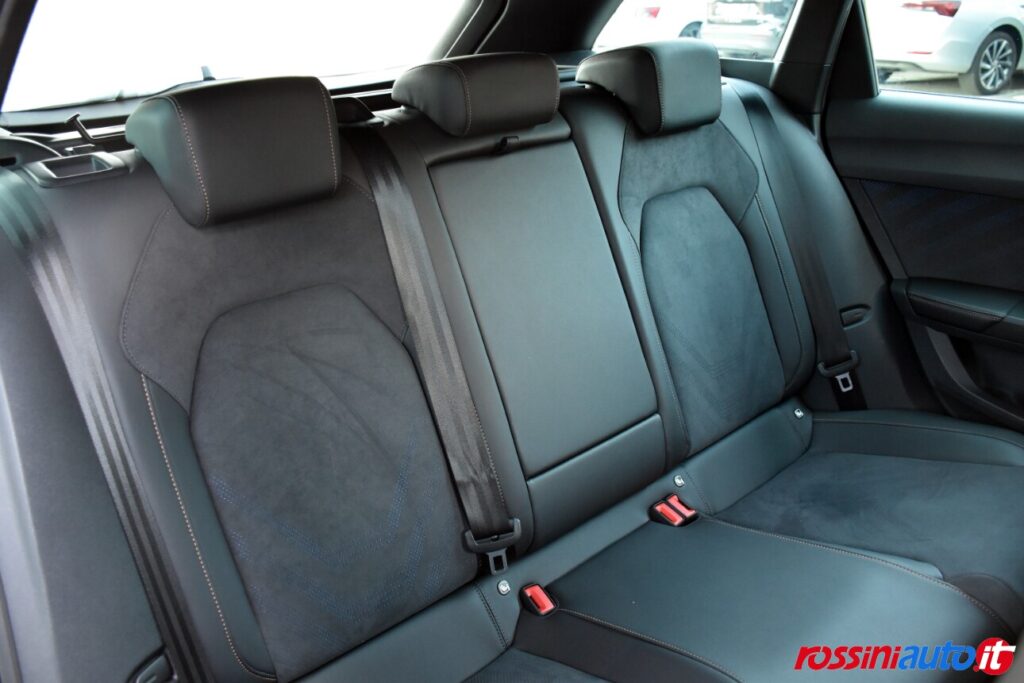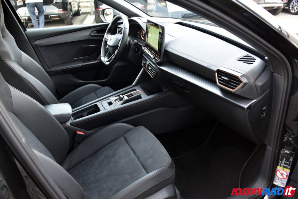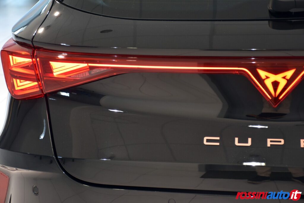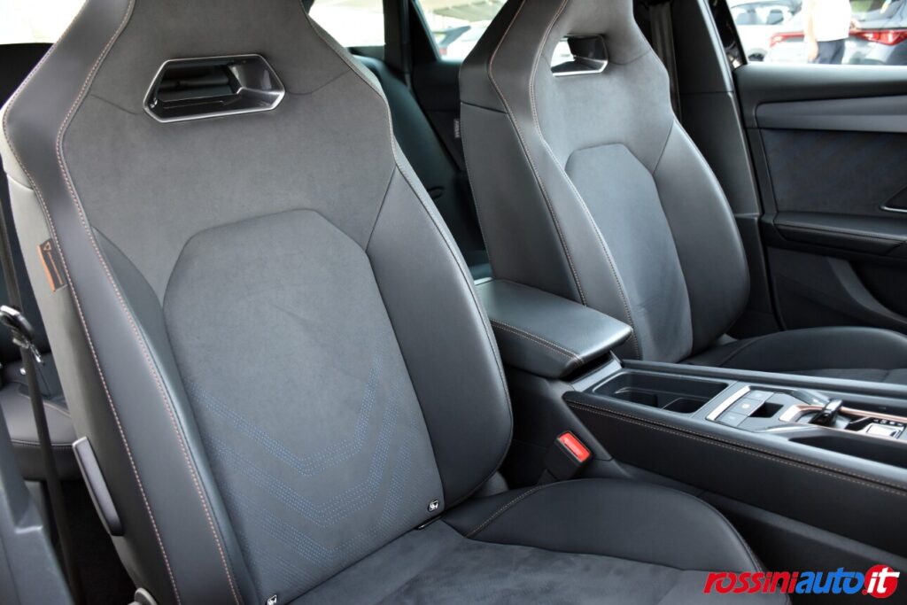 2 USB Tipo C anteriori e 2 posteriori, 7 airbag (2 frontali, 2 laterali, 2 tendina, 1 centrale), ABS (Sistema di frenata antibloccaggio), Alzacristalli elettrici anteriori e posteriori, Avvisatore acustico mancato allacciamento cintura di sicurezza, Battitacco portiere anteriori illuminato, Bocchette della ventilazione con dettagli in color rame, Bracciolo anteriore con portaoggetti integrato, Bracciolo posteriore, Cielo abitacolo nero, Climatronic tri-zona con sistema Air-care, Cornice finestrini in colore nero lucido, ACC Adaptive Cruise control, CUPRA Virtual Cockpit, DAB – Digital Audio Broadcasting, Doppio terminale di scarico visibile, Drive profile select, ESP (Controllo elettronico della stabilità), Fari fendinebbia LED con funzione cornering, Fari Full Led con indicatori di direzione dinamici, Freno di stazionamento elettrico, Front assist con sistema di frenata di emergenza e rilevamento pedoni e ciclisti, Full Link Wireless (funzione wireless disponibile con Apple CarPlay), Illuminazione ambientale a LED Smart Wraparound (cruscotto e portiere anteriori), Illuminazione Coast-to-coast con Welcome light (cerimonia di apertura e chiusura), Illuminazione interna a LED, Kessy Advanced (Sistema di avviamento senza chiave), Lane Assist (sistema di mantenimento della corsia), Limitatore di velocità, Logo CUPRA sulla griglia frontale e sul portellone posteriore, Paraurti e spoiler posteriore sportivi, Prese da 12 V anteriore e nel vano bagagli, Proiezione “CUPRA” sotto gli specchietti retrovisori esterni, Regolazione lombare sedile conducente, Sedili anteriori supersportivi Bucket in tessuto e similpelle con design CUPRA, Sedili posteriori abbattibili e ripiegabili 1/3 e 2/3, Sensori di parcheggio anteriori e posteriori, Sistema ancoraggio ISOFIX x2 (i-Size) + Top Tether x2 nei sedili posteriori, Sistema di controllo della pressione pneumatici, Sistema di rilevamento della stanchezza, Sistema E-Call (chiamata di emergenza), Sospensioni sportive CUPRA, Specchietti esterni grigio lucido riscaldati e richiudibili elettricamente, Sterzo progressivo, Tyre fit, Vetri posteriori oscurati, Volante multifunzione in pelle con design CUPRA e levette del cambio, XDS (Sistema differenziale elettronico).