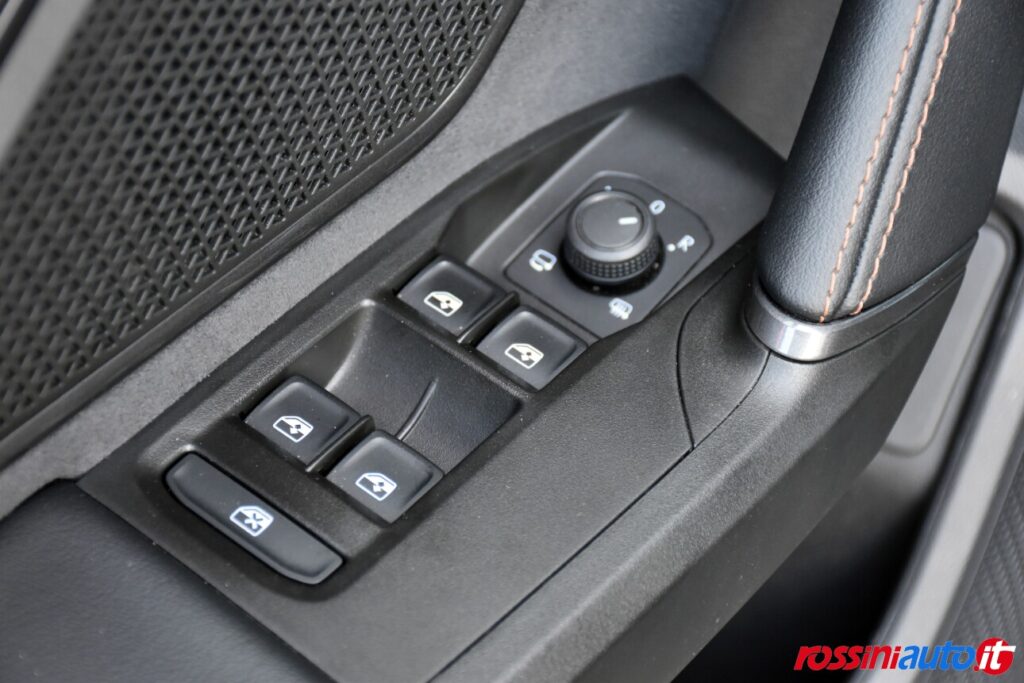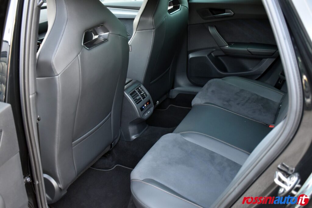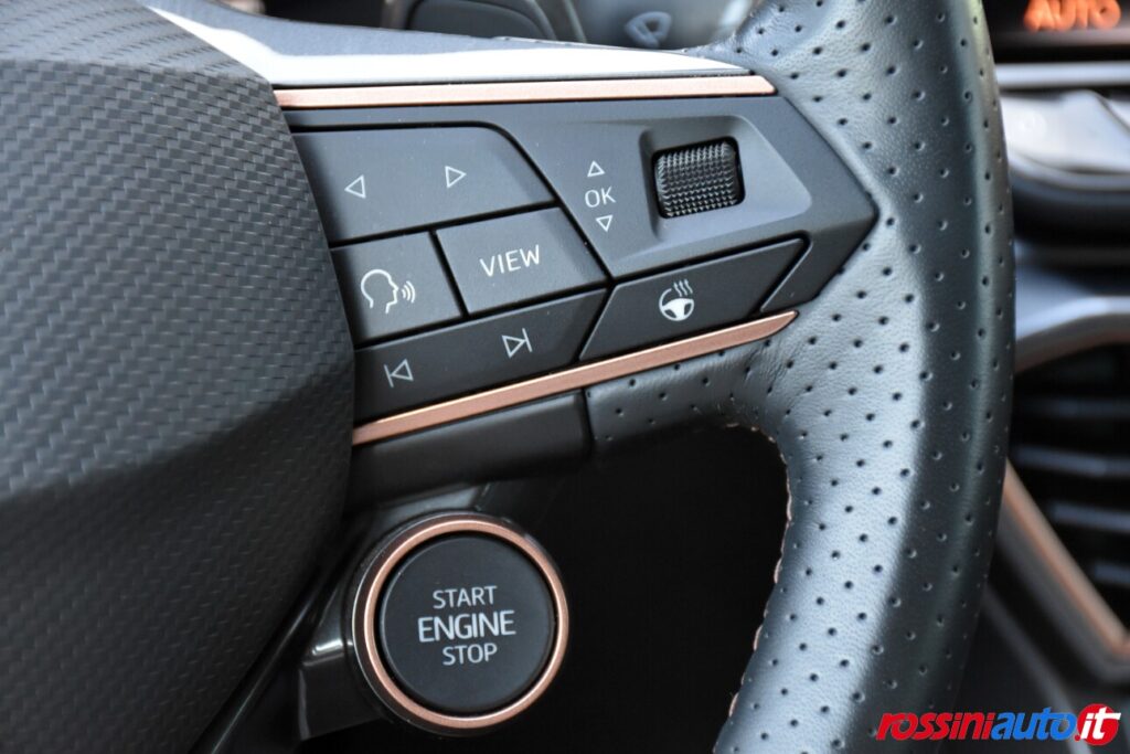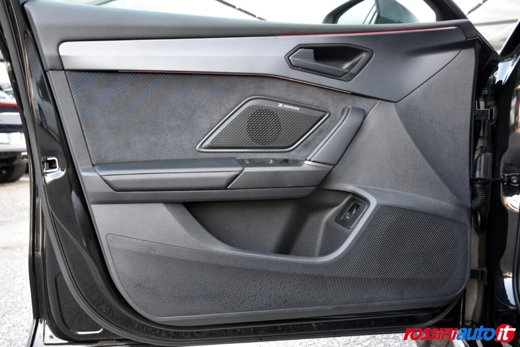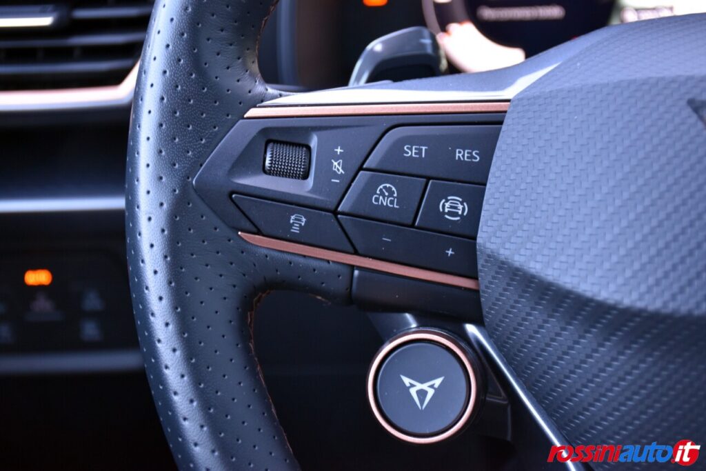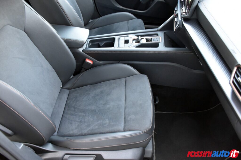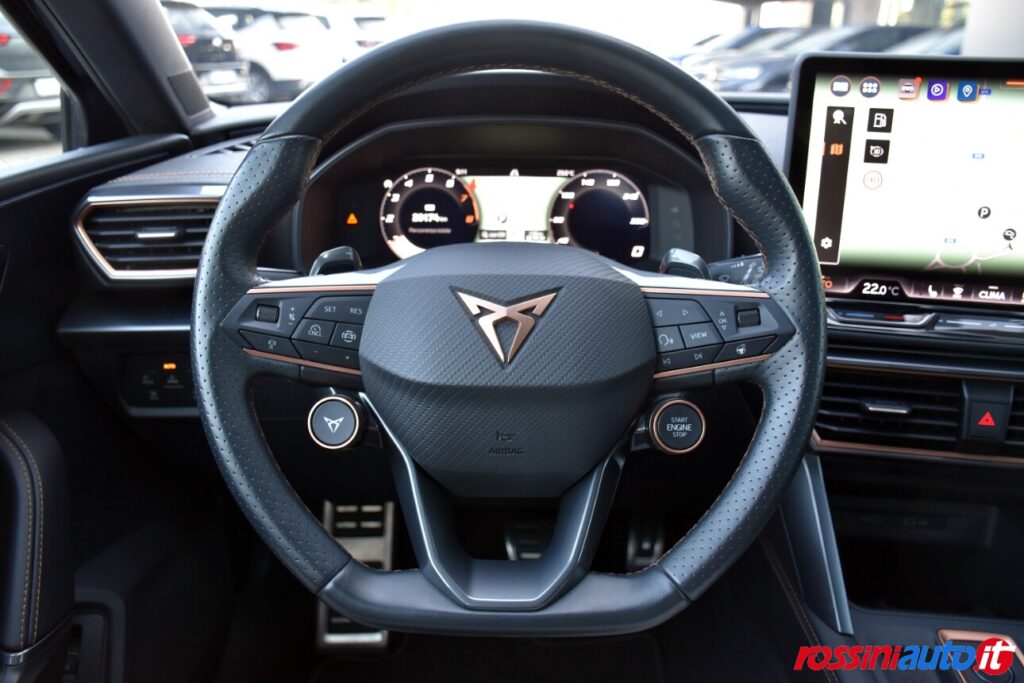 2 USB Tipo C anteriori e 2 posteriori, 7 airbag (2 frontali, 2 laterali, 2 tendina, 1 centrale), ABS (Sistema di frenata antibloccaggio), Alzacristalli elettrici anteriori e posteriori, Avvisatore acustico mancato allacciamento cintura di sicurezza, Battitacco portiere anteriori illuminato, Bocchette della ventilazione con dettagli in color rame, Bracciolo anteriore con portaoggetti integrato, Bracciolo posteriore, Cielo abitacolo nero, Climatronic tri-zona con sistema Air-care, Cornice finestrini in colore nero lucido, ACC Adaptive Cruise control, CUPRA Virtual Cockpit, DAB – Digital Audio Broadcasting, Doppio terminale di scarico visibile, Drive profile select, ESP (Controllo elettronico della stabilità), Fari fendinebbia LED con funzione cornering, Fari Full Led con indicatori di direzione dinamici, Freno di stazionamento elettrico, Front assist con sistema di frenata di emergenza e rilevamento pedoni e ciclisti, Full Link Wireless (funzione wireless disponibile con Apple CarPlay), Illuminazione ambientale a LED Smart Wraparound (cruscotto e portiere anteriori), Illuminazione Coast-to-coast con Welcome light (cerimonia di apertura e chiusura), Illuminazione interna a LED, Kessy Advanced (Sistema di avviamento senza chiave), Lane Assist (sistema di mantenimento della corsia), Limitatore di velocità, Logo CUPRA sulla griglia frontale e sul portellone posteriore, Paraurti e spoiler posteriore sportivi, Prese da 12 V anteriore e nel vano bagagli, Proiezione “CUPRA” sotto gli specchietti retrovisori esterni, Regolazione lombare sedile conducente, Sedili anteriori supersportivi Bucket in tessuto e similpelle con design CUPRA, Sedili posteriori abbattibili e ripiegabili 1/3 e 2/3, Sensori di parcheggio anteriori e posteriori, Sistema ancoraggio ISOFIX x2 (i-Size) + Top Tether x2 nei sedili posteriori, Sistema di controllo della pressione pneumatici, Sistema di rilevamento della stanchezza, Sistema E-Call (chiamata di emergenza), Sospensioni sportive CUPRA, Specchietti esterni grigio lucido riscaldati e richiudibili elettricamente, Sterzo progressivo, Tyre fit, Vetri posteriori oscurati, Volante multifunzione in pelle con design CUPRA e levette del cambio, XDS (Sistema differenziale elettronico).