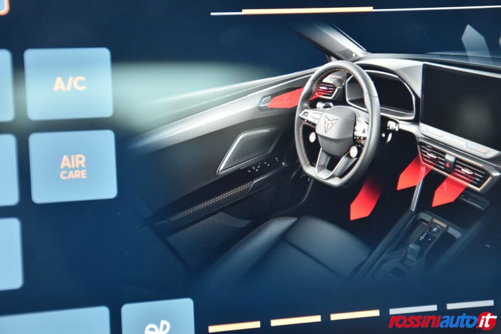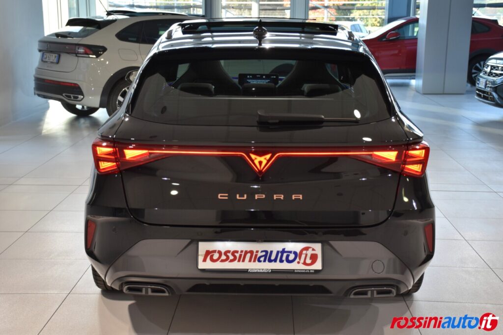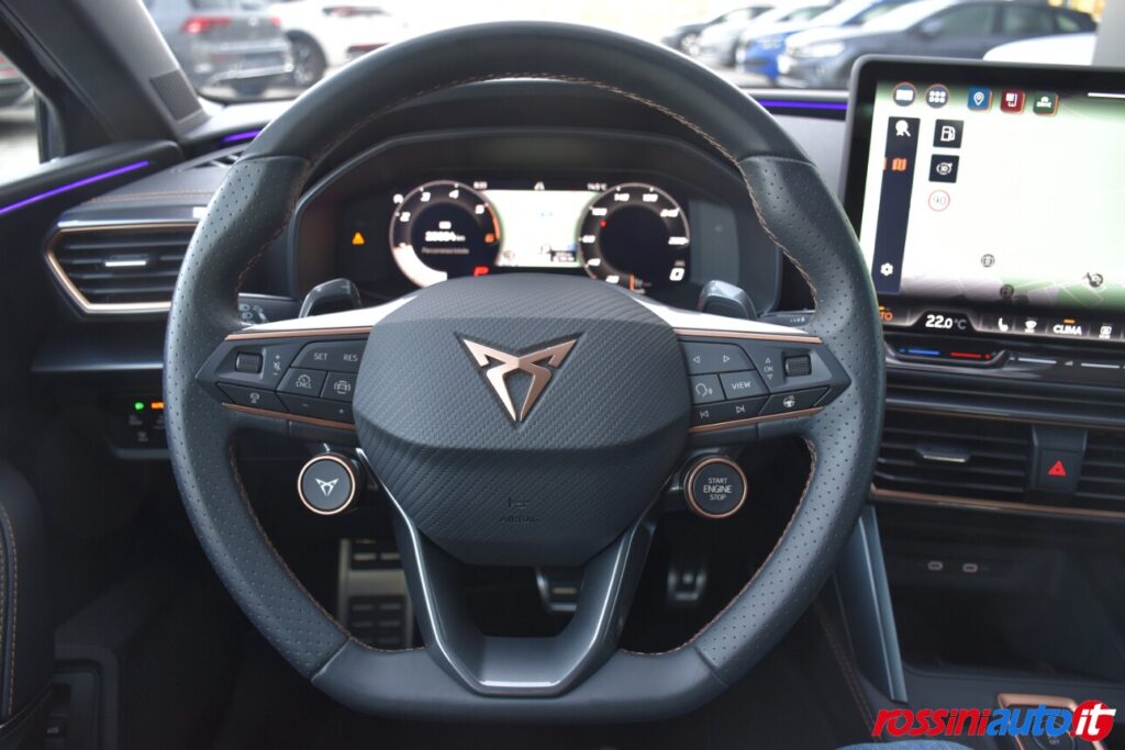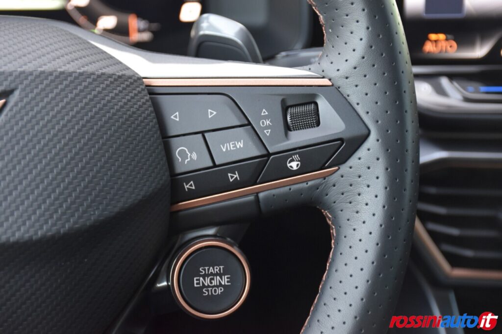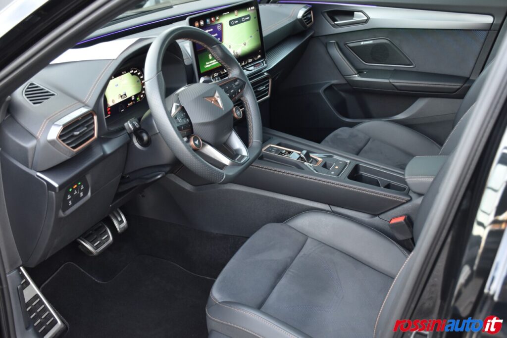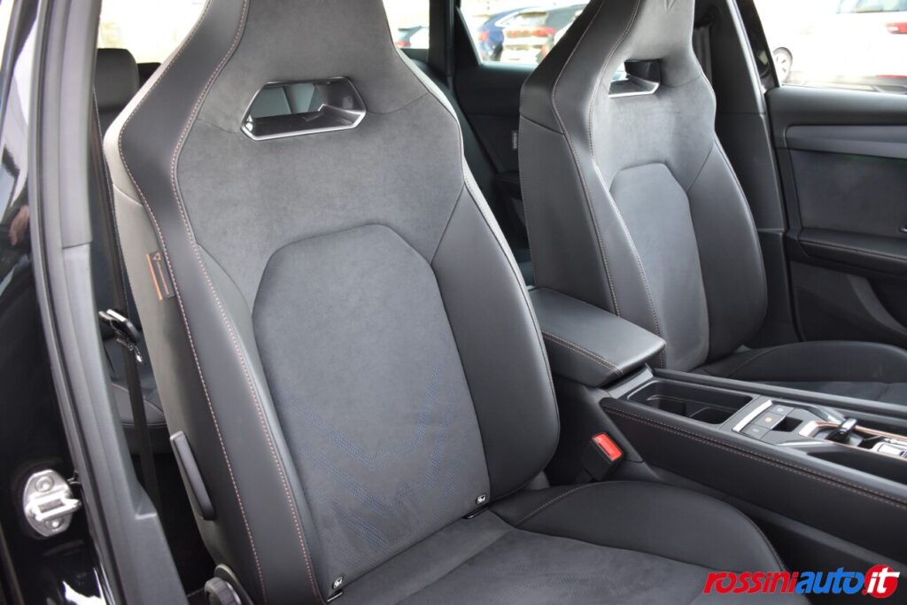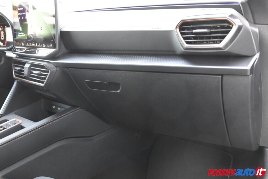 2 USB Tipo C anteriori e 2 posteriori, 7 airbag (2 frontali, 2 laterali, 2 tendina, 1 centrale), ABS (Sistema di frenata antibloccaggio), Alzacristalli elettrici anteriori e posteriori, Avvisatore acustico mancato allacciamento cintura di sicurezza, Battitacco portiere anteriori illuminato, Bocchette della ventilazione con dettagli in color rame, Bracciolo anteriore con portaoggetti integrato, Bracciolo posteriore, Cielo abitacolo nero, Climatronic tri-zona con sistema Air-care, Cornice finestrini in colore nero lucido, ACC Adaptive Cruise control, CUPRA Virtual Cockpit, DAB – Digital Audio Broadcasting, Doppio terminale di scarico visibile, Drive profile select, ESP (Controllo elettronico della stabilità), Fari fendinebbia LED con funzione cornering, Fari Full Led con indicatori di direzione dinamici, Freno di stazionamento elettrico, Front assist con sistema di frenata di emergenza e rilevamento pedoni e ciclisti, Full Link Wireless (funzione wireless disponibile con Apple CarPlay), Illuminazione ambientale a LED Smart Wraparound (cruscotto e portiere anteriori), Illuminazione Coast-to-coast con Welcome light (cerimonia di apertura e chiusura), Illuminazione interna a LED, Kessy Advanced (Sistema di avviamento senza chiave), Lane Assist (sistema di mantenimento della corsia), Limitatore di velocità, Logo CUPRA sulla griglia frontale e sul portellone posteriore, Paraurti e spoiler posteriore sportivi, Prese da 12 V anteriore e nel vano bagagli, Proiezione “CUPRA” sotto gli specchietti retrovisori esterni, Regolazione lombare sedile conducente, Sedili anteriori supersportivi Bucket in tessuto e similpelle con design CUPRA, Sedili posteriori abbattibili e ripiegabili 1/3 e 2/3, Sensori di parcheggio anteriori e posteriori, Sistema ancoraggio ISOFIX x2 (i-Size) + Top Tether x2 nei sedili posteriori, Sistema di controllo della pressione pneumatici, Sistema di rilevamento della stanchezza, Sistema E-Call (chiamata di emergenza), Sospensioni sportive CUPRA, Specchietti esterni grigio lucido riscaldati e richiudibili elettricamente, Sterzo progressivo, Tyre fit, Vetri posteriori oscurati, Volante multifunzione in pelle con design CUPRA e levette del cambio, XDS (Sistema differenziale elettronico).