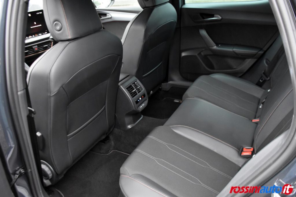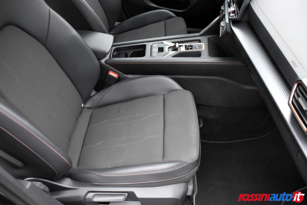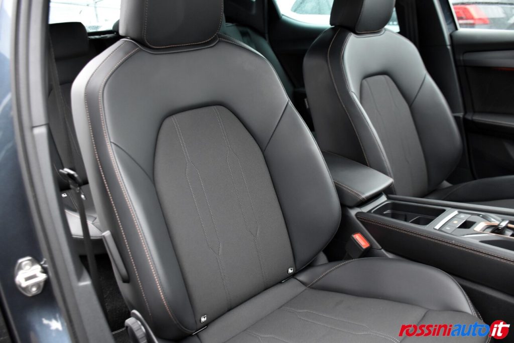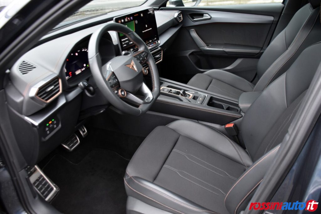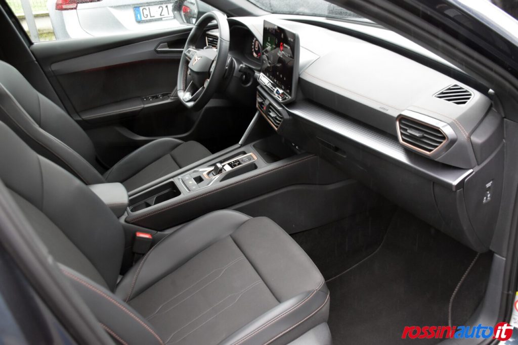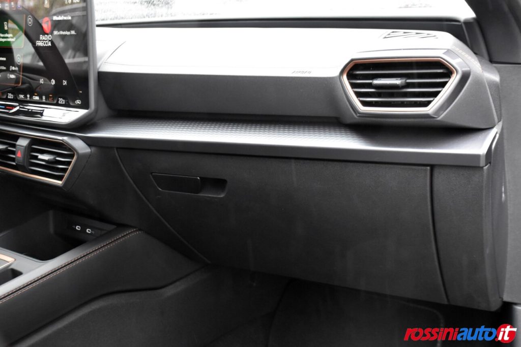 2 USB Tipo C anteriori e 2 posteriori, 7 airbag (2 frontali, 2 laterali, 2 tendina, 1 centrale), ABS (Sistema di frenata antibloccaggio), Alzacristalli elettrici anteriori e posteriori, Avvisatore acustico mancato allacciamento cintura di sicurezza, Battitacco portiere anteriori illuminato, Bocchette della ventilazione con dettagli in color rame, Bracciolo anteriore con portaoggetti integrato, Bracciolo posteriore, Cielo abitacolo nero, Climatronic tri-zona con sistema Air-care, Cornice finestrini in colore nero lucido, ACC Adaptive Cruise control, CUPRA Virtual Cockpit, DAB – Digital Audio Broadcasting, Doppio terminale di scarico visibile, Drive profile select, ESP (Controllo elettronico della stabilità), Fari fendinebbia LED con funzione cornering, Fari Full Led con indicatori di direzione dinamici, Freno di stazionamento elettrico, Front assist con sistema di frenata di emergenza e rilevamento pedoni e ciclisti, Full Link Wireless (funzione wireless disponibile con Apple CarPlay), Illuminazione ambientale a LED Smart Wraparound (cruscotto e portiere anteriori), Illuminazione Coast-to-coast con Welcome light (cerimonia di apertura e chiusura), Illuminazione interna a LED, Kessy Advanced (Sistema di avviamento senza chiave), Lane Assist (sistema di mantenimento della corsia), Limitatore di velocità, Logo CUPRA sulla griglia frontale e sul portellone posteriore, Paraurti e spoiler posteriore sportivi, Prese da 12 V anteriore e nel vano bagagli, Proiezione “CUPRA” sotto gli specchietti retrovisori esterni, Regolazione lombare sedile conducente, Sedili anteriori supersportivi Bucket in tessuto e similpelle con design CUPRA, Sedili posteriori abbattibili e ripiegabili 1/3 e 2/3, Sensori di parcheggio anteriori e posteriori, Sistema ancoraggio ISOFIX x2 (i-Size) + Top Tether x2 nei sedili posteriori, Sistema di controllo della pressione pneumatici, Sistema di rilevamento della stanchezza, Sistema E-Call (chiamata di emergenza), Sospensioni sportive CUPRA, Specchietti esterni grigio lucido riscaldati e richiudibili elettricamente, Sterzo progressivo, Tyre fit, Vetri posteriori oscurati, Volante multifunzione in pelle con design CUPRA e levette del cambio, XDS (Sistema differenziale elettronico).