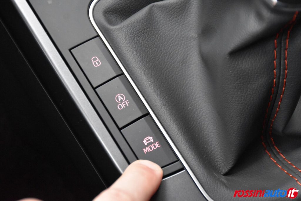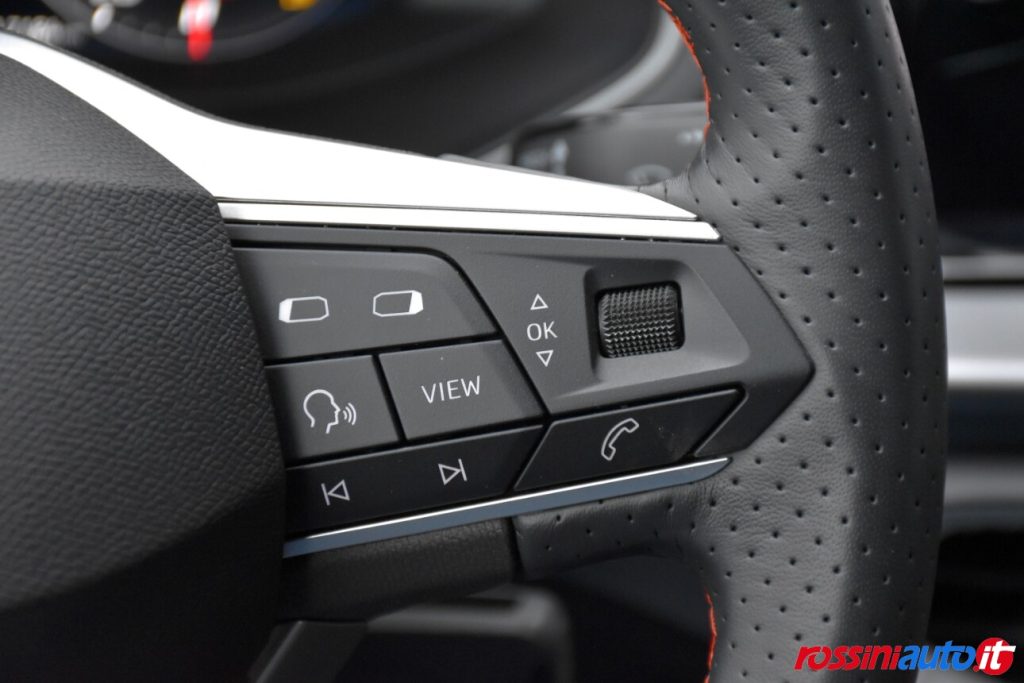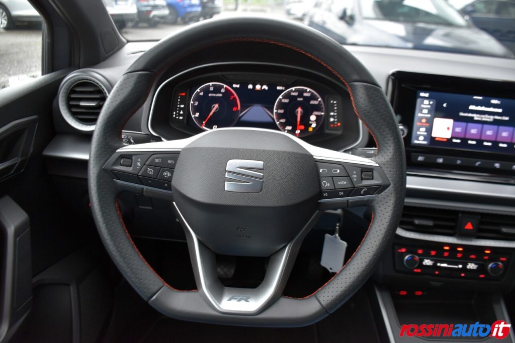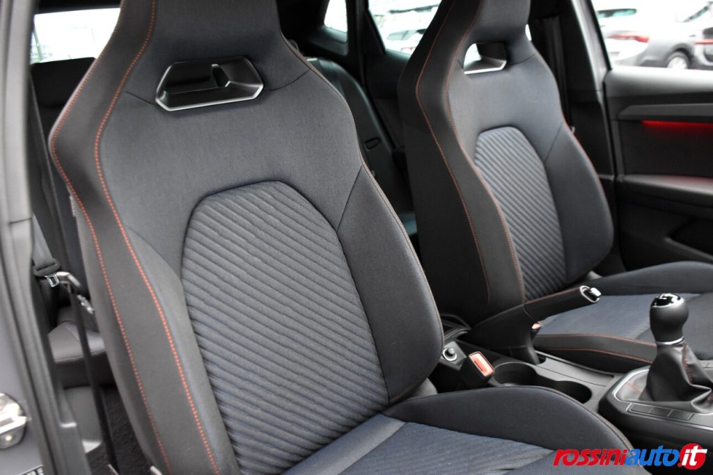 ABS (Sistema di frenata antibloccaggio) + ESP (Controllo elettronico della stabilità) , Airbag anteriori frontali e laterali a tendina, Alzacristalli elettrici anteriori, Avvisatore acustico mancato allacciamento cintura di sicurezza, Ambient light selezionabile bianco/rosso su interno porta, Cambio manuale, Cerchi in lega da 17˝ “Dynamic”, Chiusura centralizzata con telecomando + 2 chiavi richiudibili, Climatizzatore manuale, Cruise control, Cinture di sicurezza anteriori e posteriori con bordature Rosso FR, Doppio terminale di scarico, Dash pad centrale in Nero Brillante, Disattivazione airbag passeggero, Fari posteriori a LED, Fari fendinebbia con funzione cornering, Front assist (con Sistema di frenata di emergenza automatico e sistema di riconoscimento pedoni), Hill Hold Control, Logo FR su griglia frontale e portellone posteriore, Media System Color 6 altoparlanti Bluetooth Touch screen capacitivo 6,5″ a colori Volante multifunzione Ingresso AUX, USB, SD, Pannelli interno porta in tessuto dedicato FR e inserti neri, Paraurti sportivi, Profili finestrini esterni Nero Brillante, Quadro strumenti cromato, Specchietti esterni con calotte Nero Brillante, Specchietti esterni riscaldabili elettricamente, Sospensioni sportive, Sedile passeggero regolabile manualmente in altezza, Sistema ISOFIX + Top Tether (2) nei sedili posteriori, Sedile posteriore abbattibile e frazionabile, Sedili sportivi in tessuto dedicato FR, Sistema di controllo della pressione pneumatici, SEAT Drive Profile, Tyre fit, Vetri posteriori oscurati, Volante, leva del cambio e freno a mano in pelle, Volante sportivo in pelle con inserti Nero Brillante e logo FR.
