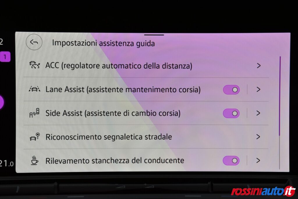 Di serie la vettura è ricca di dotazioni di serie per il comfort di marcia e la sicurezza, infatti troviamo fanaleria anteriore e posteriore a LED, gli utili sensori di parcheggio anteriori e posteriori ed il sensore luce/pioggia. Al suo interno la plancia Hi-Tech presenta al guidatore il quadro strumenti interamente digitiale da 10,5 pollici completamente personalizzabile, il sistema di navigazione Touch Screen e le pulsantiere interamente a Soft Touch con APP Connect e ricarica smartphone Wireless. Per la sicurezza oltre a ben 8 Airbag e tutti i controlli di stabilità abbiamo gli ADAS di livello 2 con ACC-Adaptive Cruise Control ed il Lane Assist mantenimento della corsia.
