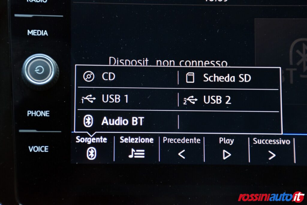 2 Slot USB (compatibili iPod/iPhone), 3 appoggiatesta posteriori ribassabili, Airbag guida e passeggero con sist disattiv. airbag passeggero, ABS, Accensione autom. fari con funzione “Coming/Leaving Home”, Adaptive Cruise Control (ACC), Airbag anteriore passeggero con disattivazione, Airbag laterali anteriori, Airbag per la testa a tendina, Alzacristalli elettrici anteriori e posteriori, App Connect, Appoggiabraccia anteriore, Cambio manuale a 6 rapporti, Cerchi in lega 7J x17″ Mayfield, Chiusura centralizzata con radiocomando, Climatizzatore manuale con filtro anti allergeni, Cromo & Style Pack, Display multifunzione, Fari fendinebbia con luce direzionale, Fatigue Detection, ESC+ABS, ASR, EDS, MSR, Front Assist, Funzione “Coming Home/Leaving Home”, Gruppi ottici post. a LED, Hill-Holder, Indicatori di direzione integrati nei retrovisori esterni, Interni in tessuto, Lane Assist (Sist. di assistenza al mantenimento di corsia), Luci diurne a LED, Pacchetto luce e visibilità, Park Pilot – Sensori di parcheggio anteriori e posteriori, Piano di copertura vano bagagli ribaltabile ed estraibile, Pomello del cambio in pelle, Predisposizione fissaggio seggiolino bambino norma “Isofix”, Pretensionatore cinture anteriori, Radio “Ready2Discover” da 8”, Ready for We Connect e We Connect Plus, Ricezione Radio Digitale DAB+, Sedile posteriore con schienale divisibile asimmetricamente e ribaltabile, Sensore pioggia, Servosterzo elettromeccanico, Specchietti retrovisori esterni regolabili e riscaldabili elettronicamente, Spia di controllo pressione pneumatici, Tergilunotto con regolazione di intermittenza, Tire Mobility Set (kit riparazione pneumatici), Volante multifunzionale in pelle, Volante regolabile in altezza e profondità.