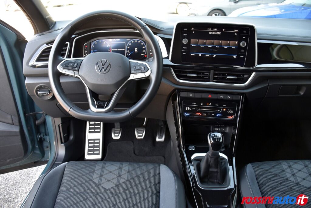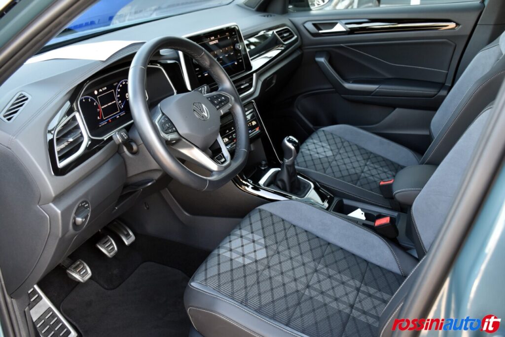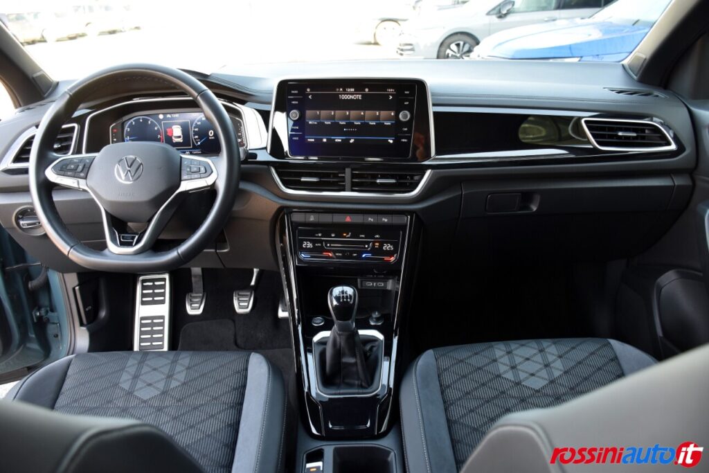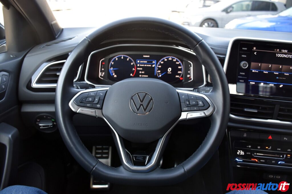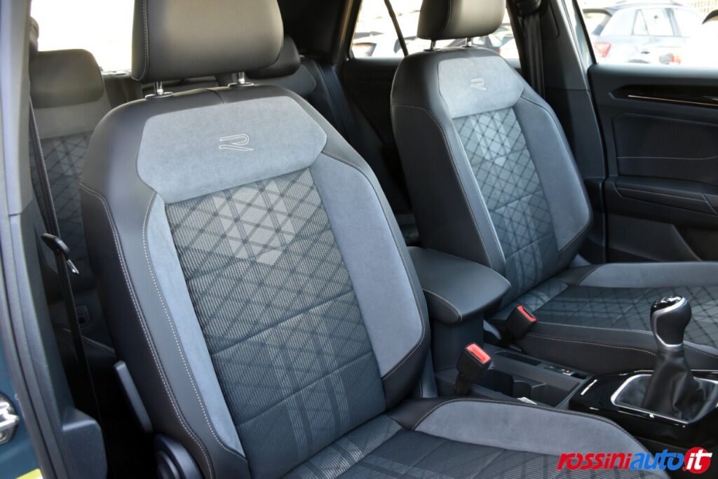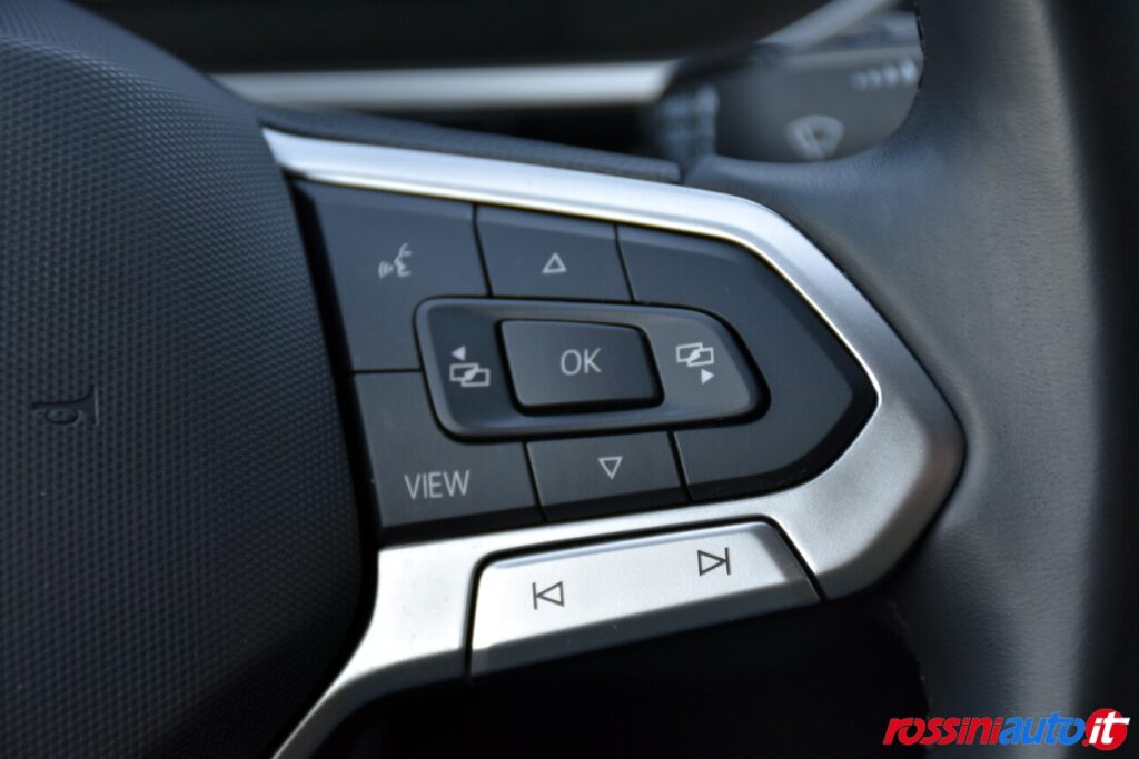 2 luci di lettura anteriori, 2 luci LED nel vano piedi anteriore, 2 Prese C-USB anteriori, 2 x USB-C nella parte posteriore del bracciolo con la sola funzione di ricarica, 6 altoparlanti, ACC – Adaptive Cruise Control “Stop & go”, Airbag a tendina per passeggeri anteriori e posteriori + per conducente e passeggero (lato passeggero disattivabile), Alzacristalli elettrici anteriori e posteriori, Ambient Light, App-Connect con funzione wireless per CarPlay(Apple), Android Auto (Google), Applicazioni cromate, Applicazioni cromate ai tasti anteriori, Appoggiatesta anteriori regolabili, Assistente di mantenimento corsia Lane Assist, Attrezzi di bordo, Bluetooth, Bocchette di aerazione posteriori, Bracciolo centrale anteriore con vano portaoggetti regolabile in altezza e lunghezza, Cambio manuale a 6 marce, Caratterizzazioni specifiche R-Line, Cassetto sotto il sedile ant. destro, Cerchi in lega “Valencia” 7Jx17″ in Galvano Grey, Chiusura centralizzata con telecomando, Climatizzatore manuale, Controllo pressione pneumatici, Controllo Elettronico Stabilità (ESC) ABS, ASR, EDS, MSR e stabilizz. Rimorchio, Cristalli posteriori oscurati, Digital Cockpit Pro da 10,25″, Dispositivo antiavviamento elettronico, Divano post. non sdoppiabile, schienale divisibile e ribaltabile, appoggiabraccia centrale, Emergency Call, Fari anteriori e posteriori a LED, Fatigue Detection – Rilevatore di stanchezza del conducente, Freno di stazionamento elettronico con funzione Auto-Hold, Front Assist con frenata d’emergenza, Funzione Coming Home e funzione Leaving Home, Hill Start Assist, Illuminazione ambiente a LED bianca, Inserti decorativi “Lava Stone Black”, Lane Assist (Sistema di assistenza al mantenimento di corsia), Light Assist – Regolazione automatica abbaglianti, Listelli sottoporta nei vani porta, Mancorrenti cromati, Parabrezza in vetro atermico, Paraurti R-Line, Park Assist: Sistema di parcheggio automatico, Park Pilot – Sensori di parcheggio anteriori e posteriori, Pedaliera in acciaio spazzolato, Piano di copertura vano bagagli regolabile ed estraibile, Radio “Ready2Discover” con display touchscreen da 8”, Ready for We Connect e We Connect Plus, Ricezione Radio Digitale DAB+, Riconoscimento pedoni, Rivestimento sedili in tessuto, Sedile conducente e passeggero regolabili in altezza, Sedili anteriori comfort, Sensore pioggia, Servosterzo elettromeccanico in funzione della velocità, Sistema di protezione proattivo, Sistema ISOFIX per ancoraggio seggiolini nel divano posteriore, Sistema Start/Stop con sistema di recupero dell’energia in frenata, Specchietti retrovisori esterni riscaldabili, regolabili e ripiegabili elettricamente, Specchietto retrovisore interno schermabile automaticamente, Supporto lombare sedili anteriori e sedile del passeggero anteriore ribaltabile, Tire Mobility Set (kit riparazione pneumatici), Volante sportivo multifunzione in pelle, Volante regolabile in altezza e